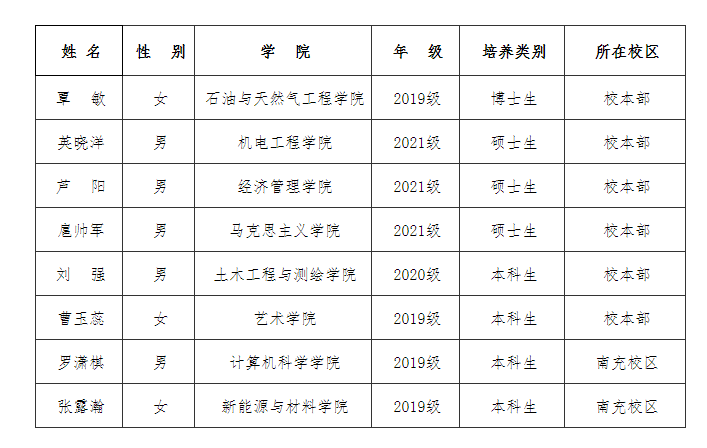 本次学生“优秀共产党员”的评选是学校党委学生工作部(处)根据学校《关于开展学校“两优一先”评选表彰工作的通知》《关于开展西南石油大学学生“优秀共产党员”评选表彰工作的通知》,经个人申报、学院推荐、学校评审等程序进行,本次全校获评的学生“优秀共产党员”共计8名同志,其中博士生1名、研究生3名、本科生4名。