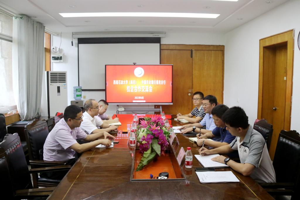 6月14日下午,中国农业银行南充分行行长邱果一行到南充校区走访交流,与南充校区副校长谌贵辉座谈交流。