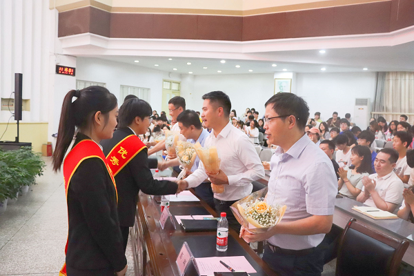 报告会上,与会领导为2023届优秀学生代表颁发了绶带,2023届优秀学生代表向与会老师献花,对老师表达了感恩之情。