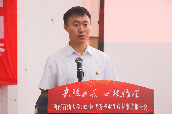 8名2023届优秀学生代表依次进行了分享。他们结合自身学习生活经历分享自己大学四年收获,鼓励学弟学妹们,要提前合理规划好大学生活,明确自己的发展目标,端正自己的学习态度,积极参加学校和学院的活动,挑战自己、充实自己,提升自己的综合素质。此次报告会还邀请到一位特殊的“毕业生”——机电工程学院辅导员王晓龙。从母校毕业后,他选择回到南充校区,成为一名辅导员,他向同学们讲述了自己求学期间及返校任教后的心路历程,勉励同学们要牢记初心,做到“来时的路有收获,未来的路有期盼,脚下的路有方向”。