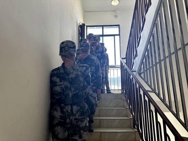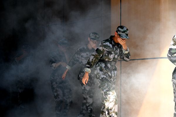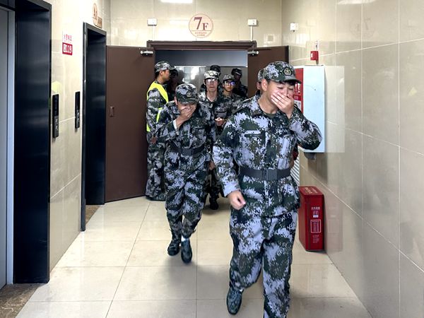 伴随着急促的哨声及燃起的烟雾,演练正式开始。各楼层教官和疏散引导员迅速行动,组织同学们紧急疏散,在教官和疏散引导员的指挥下,同学们捂住口鼻,低头弯腰,按照演练预设路线规范、有序撤离,各楼层疏散引导员清点无人员遗漏后迅速撤离,快速奔向田径运动场避险。抵达田径运动场后,各连队指导员迅速清点人数,确认无人员受伤后,向总指挥汇报。总指挥对此次消防演练作了点评。
