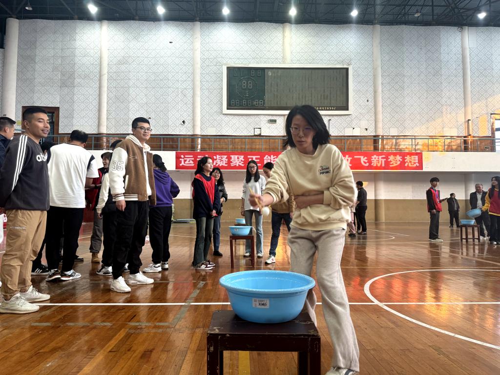 首先进行的是筷运乒乓球,每支参赛队伍分为两组,进行接力赛,老师们右手执筷,左手挡风,或是小心翼翼,或是快步疾走,完成乒乓球的运送。每当一组完成乒乓球的运送任务,场边都会响起热烈的欢呼声,为队友喝彩。