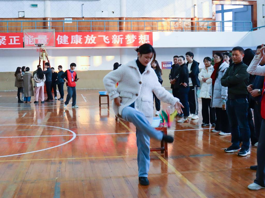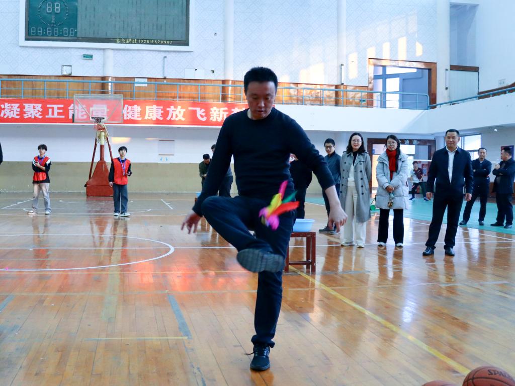 踢毽子比赛中,老师们身姿灵巧,精神抖擞,动作敏捷,跑着踢,蹦着踢,侧身踢,花样踢......,辗转腾挪间,做出各种各样的动作,五彩毽子上下翻飞,在比赛场上绘出了一幅活力四射、其乐融融的画卷