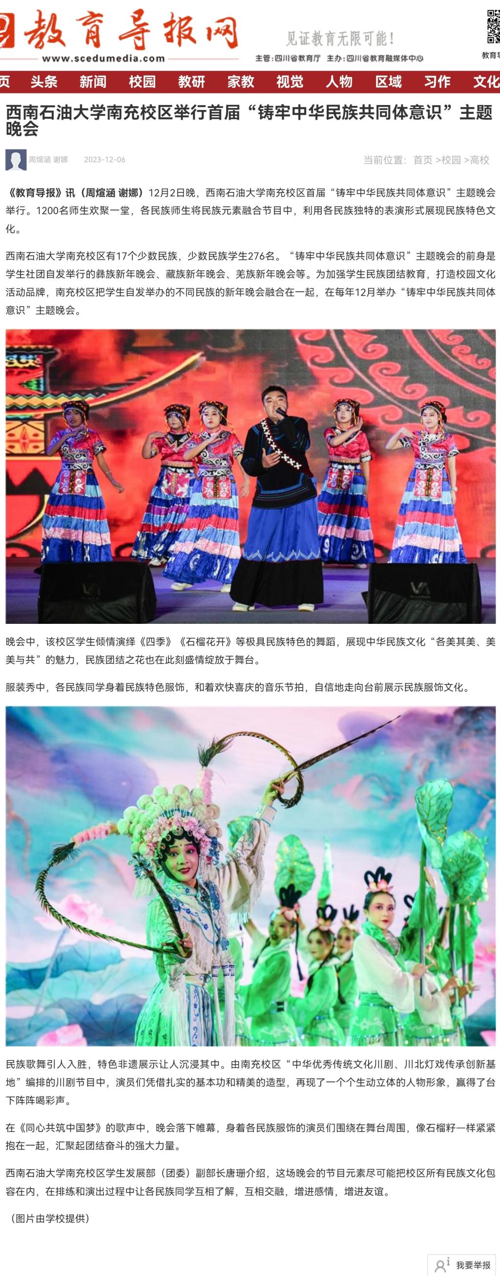 12月6日,教育导报网以《西南石油大学南充校区举行首届“铸牢中华民族共同体意识”主题晚会》为题,报道南充校区首届“铸牢中华民族共同体意识”主题晚会,以下是报道原文。