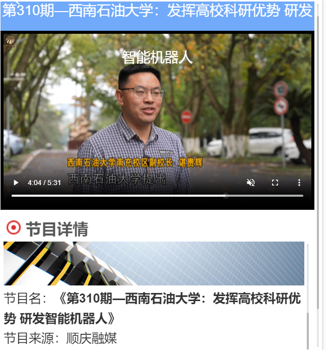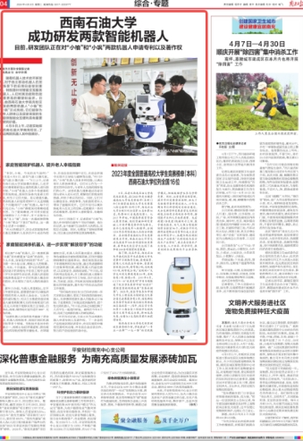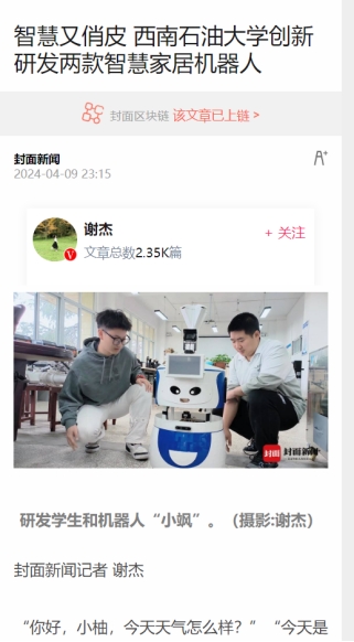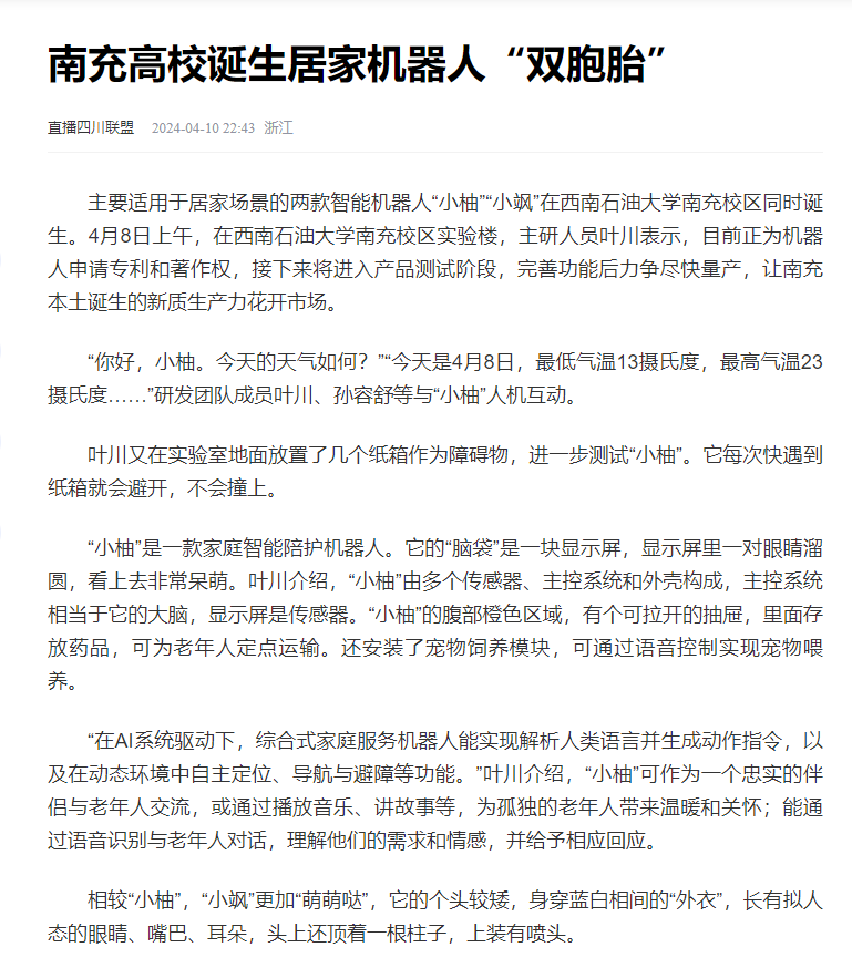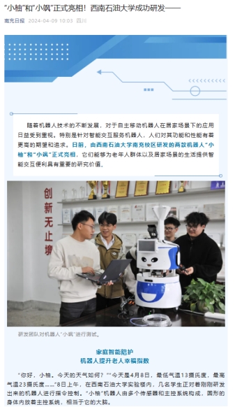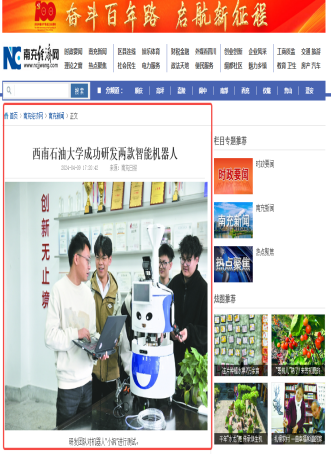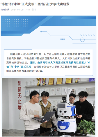 4月9日,南充日报以《西南石油大学成功研发两款智能机器人》为题展开了相关报道。封面新闻以《智慧又俏皮 西南石油大学创新研发两款智慧家居机器人》为题展开了相关报道。南充新闻以《“小柚”和“小飒”正式亮相!西南石油大学成功研发》为题展开了相关报道。南充经济网以《西南石油大学成功研发两款智能机器人》为题展开了相关报道。4月10日,直播四川联盟以《南充高校诞生居家机器人“双胞胎”》为题展开了相关报道。4月11日,顺庆融媒以《西南石油大学:发挥高校科研优势 研发智能机器人》为题展开了相关报道。