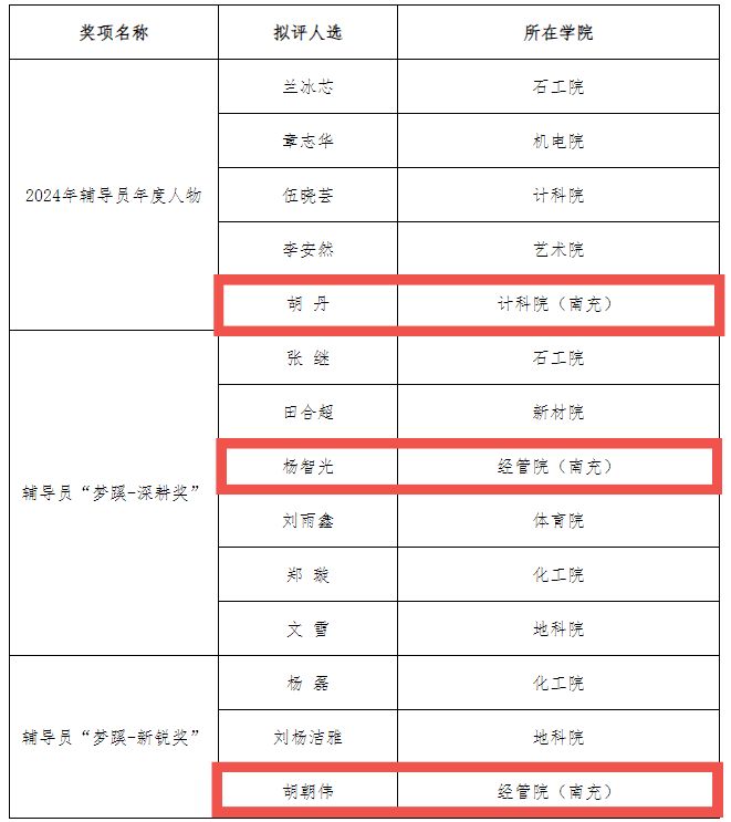 为充分发挥辅导员先进的示范引领作用,切实推动辅导员队伍建设高质量发展,近日,学校开展2024年辅导员先进个人的评选工作,计算机与软件学院辅导员胡丹荣获学校2024年“辅导员年度人物”,经济管理学院辅导员杨智光荣获“梦溪-深耕奖”,经济管理学院辅导员胡朝伟荣获“梦溪-新锐奖”。