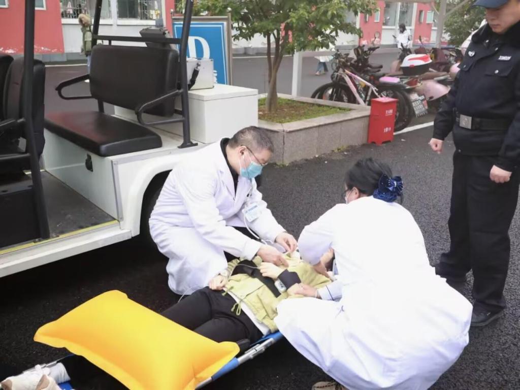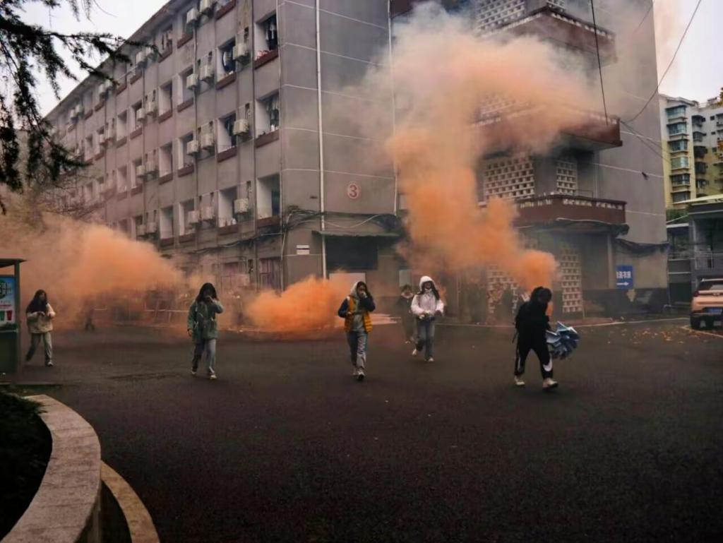 演练模拟学生公寓2号楼、3号楼某寝室因不明原因突发火灾,产生大量浓烟。楼道内工作人员发现后立即吹响口哨,组织同学们疏散,同时拨打校园报警电话求助。楼内学生听到哨声后,按照疏散引导员指示,用手捂口鼻,从安全通道有序疏散。同时,校园警务服务中心民警和辅警及时赶往起火地点进行应急处置。1名学生因逃生过程中吸入大量浓烟晕倒在2号楼楼梯平台,警务人员和医务人员在搜救过程中使用担架将该同学成功救出。至此本次消防演练圆满结束。