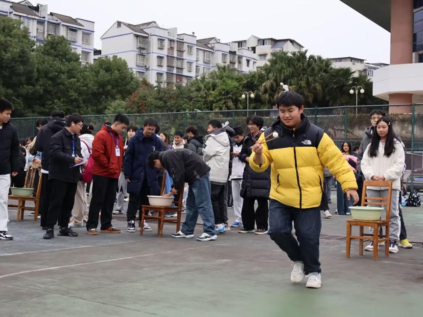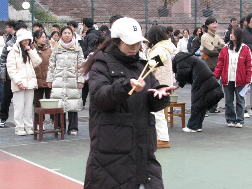 12月13日下午,学生筷子夹乒乓球比赛在篮球场举行,来自十七个专业代表队共一百七十名学生参加了此次比赛。比赛规则独特,每队十人分为两组,每组五人接力传递乒乓球,用筷子夹起十个球后交由对方队员继续,用时最短的队伍取得胜利,考验了团队协作与个人技能的双重能力。赛前,赛场人声鼎沸,参赛选手们跃跃欲试。随着裁判的一声令下,选手们迅速拿起筷子,紧盯目标乒乓球,小心翼翼地夹起,以最快速度向终点跑去。赛场上,有的选手手法娴熟,快速准确地夹起一个又一个乒乓球,引得观众阵阵喝彩;有的选手则略显紧张,乒乓球多次滑落,但他们毫不气馁,迅速调整状态继续挑战,展现了良好的竞技精神。观众的热情互动也为比赛增添了热烈氛围,呐喊助威声此起彼伏,整个赛场洋溢着紧张而又欢乐的气息。最终电子与计算机工程专业代表队以用时十九分十五秒的成绩夺得冠军。光电信息科学与工程专业代表队、材料化学专业代表队分别荣获亚军和季军。