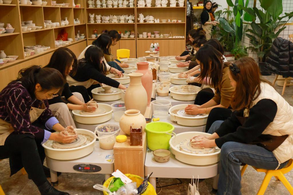 活动现场,陶艺师首先为大家介绍了陶艺的历史文化、制作工艺和基本技巧。随后,在陶艺师的指导下,老师们开始了陶艺创作。她们围坐在陶艺拉坯机前,双手轻轻触摸着湿润的陶泥,在旋转的拉坯机上,小心翼翼地塑造着心中的作品。有的辅导员专注地拉坯,努力让陶泥在手中变得规整;有的则在精心雕琢细节,为作品增添独特的韵味。过程中,大家互相交流、互相学习,现场充满了欢声笑语。