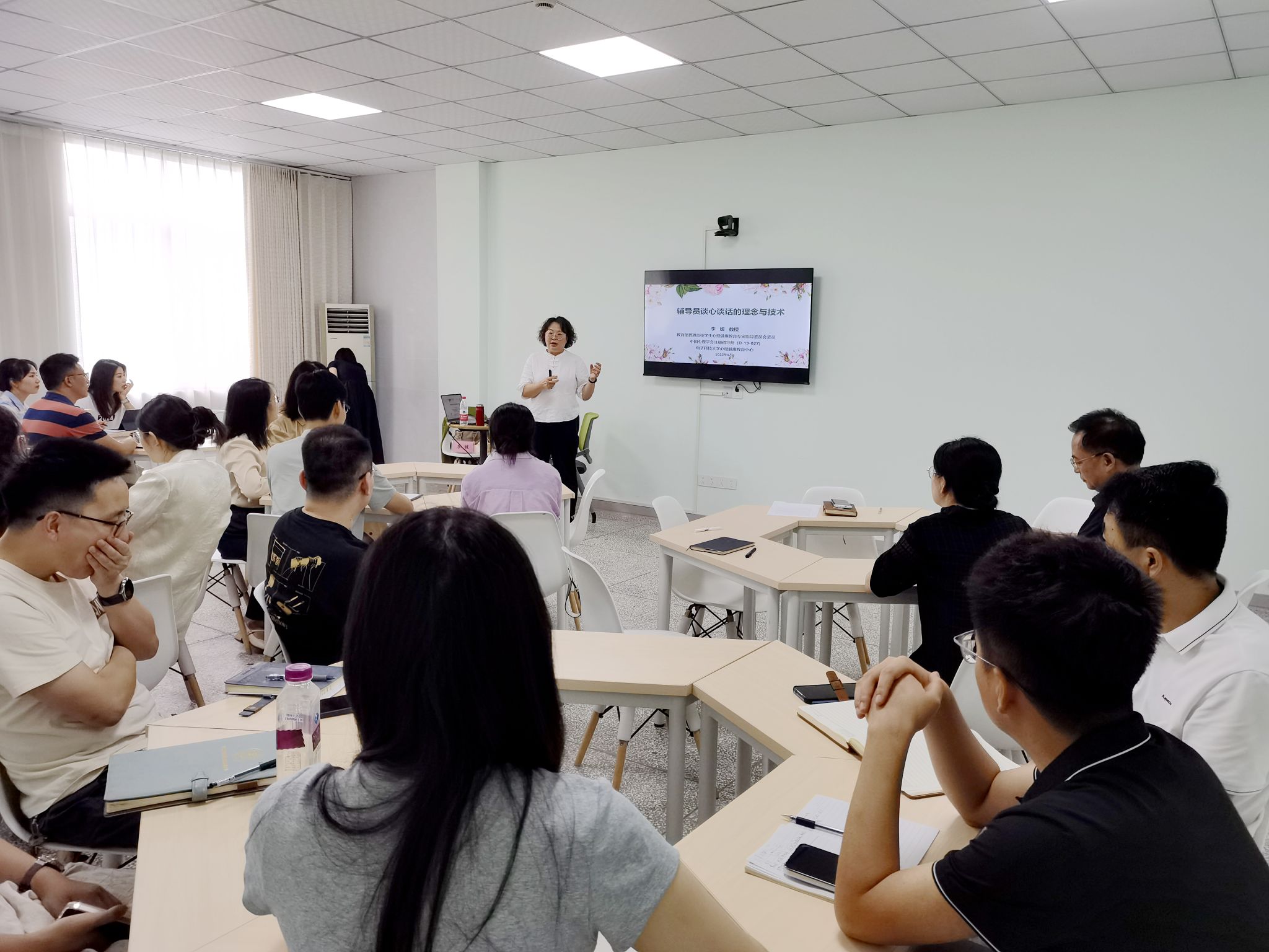 培训中,李媛教授结合辅导员工作实际,深入阐述了谈心谈话的核心价值,即及时掌握学生动态、识别潜在问题并提供有效支持。她不仅重点讲解了谈心谈话的工作理念,还系统介绍了可操作的谈话技术框架,为辅导员们提供了实用的工作指南。此外,李媛教授还特别强调了辅导员自我关怀的重要性,指出这是保障工作可持续性的关键。