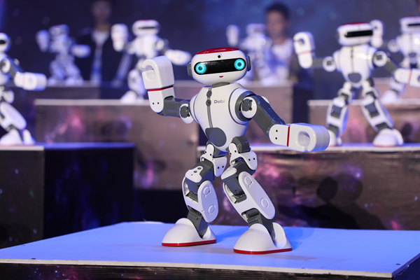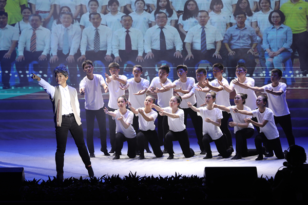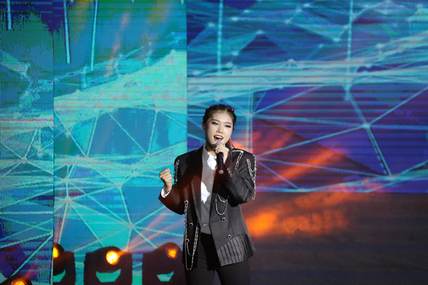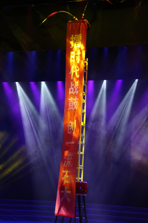 荧光舞《未来之光》以炫酷的闪光,动感的乐曲和机器人群舞将现场气氛推到高潮,自贡杂技团为我们带来了一场惊心动魄的视觉盛宴《战鼓》,演员头戴长冠,立于鼓上,依靠摞在一起的凳子节节攀升,展出一道横幅“擂时代战鼓,创一流石大”。