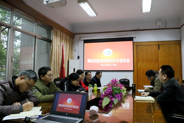 11月28日,南充校区在西会议室召开了校区党外知识分子座谈会。校长助理、南充校区党委常务副书记张光君,南充校区党委副书记、纪委书记覃鸿飞出席座谈会,与校区党外知识分子鲜义才、严宇、柏宇、张海珍、柴国栋进行了座谈交流。会议由南充校区党群工作部(工会)副部长陈万林主持。