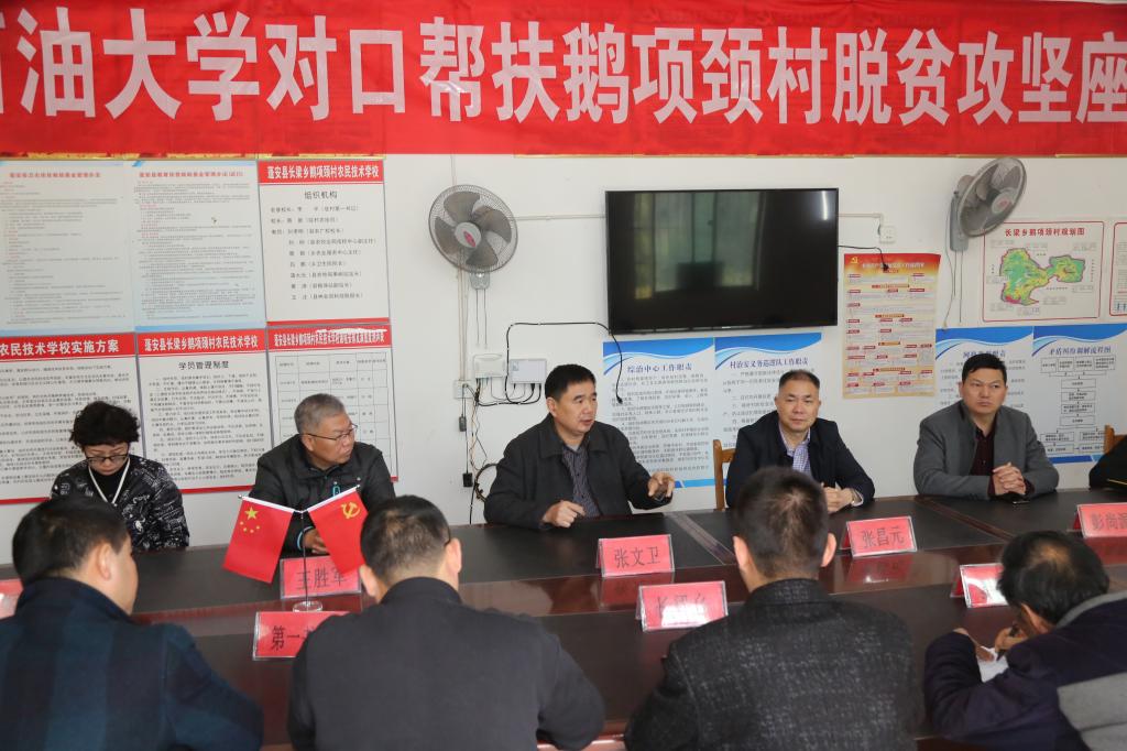 张文卫表示,西南石油大学会一如既往地对鹅项颈村进行帮扶,2019年对口帮扶工作还要早做规划,继续做好党组织和脱贫群众结对帮扶等工作,对村上提出的相关问题将积极研究帮助推动解决。