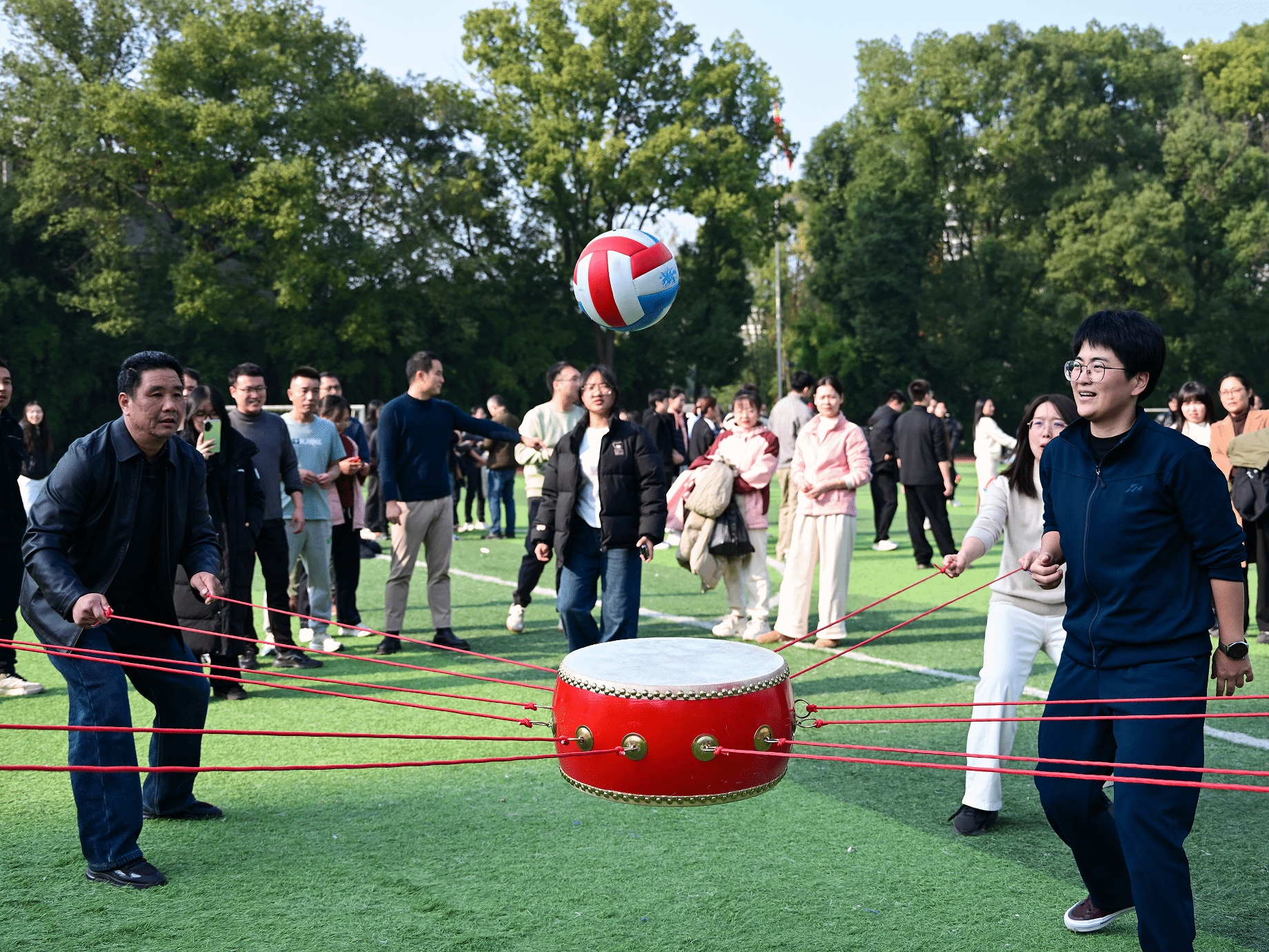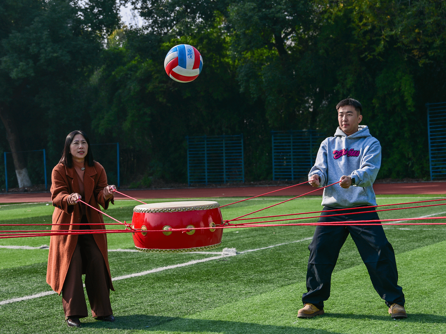 11月27日,教职工同心鼓比赛在田径场拉开帷幕。11支队伍同台竞技,每队成员需共同牵绳击鼓,在2分钟内完成尽可能多的颠球。比赛中,老师们全神贯注,步伐协调一致,即便偶有失误,也迅速调整状态,再接再厉。经过激烈比拼,安全与后勤保障部代表队以167次的优异成绩摘得桂冠,教务部与理学院代表队则分别荣获亚、季军。