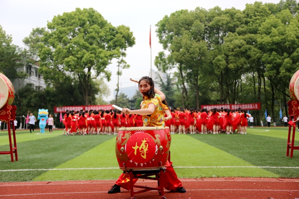 信息学院300余名同学表演了大型舞蹈《鼓舞新时代》,场面气势恢弘,振奋人心。潇洒自如的旗舞,荡气回肠的鼓声,信息学院学子着装鲜艳明亮,手举红旗,跟着音乐的节拍,依托队形变化,摆出“五四三二一”“IT”“五四100”“SWPU”等不同字样,以舞动的身姿展现了青春的活力。同时,场边12位同学表演了精彩的鼓舞。场上大鼓摆开,中间四名身着统一服装的学生伴随着音乐的律动,上身前倾,执鼓槌擂奏,用头、肩、手、腰的扭、甩、转、端、蹬等构成大开大合、对比强烈的动作组合,配合默契,动作一气呵成令人震撼。