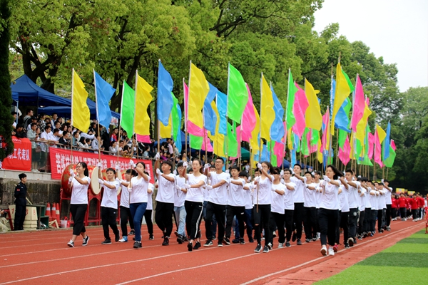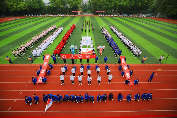 春风吹,战鼓响,四月石大梦飞扬;骄阳烈,健儿笑,运动赛场当英豪。伴随着激昂的运动员进行曲,气宇轩昂的国旗护卫队迈着铿锵有力的步伐,护卫鲜艳的五星红旗,率先入场,校旗方队、运动会会旗队、吉祥物红红、蓝蓝、彩旗方队和各专业方队,身着绚丽的服装,手持特色道具,和着铿锵音乐,迈着矫健的步伐,昂首阔步地依次从主席台前走过,飒爽的英姿向着明媚的天空,明净的脸庞洋溢青春的活力,矫健的步伐迈出青春的自信,意气风发。