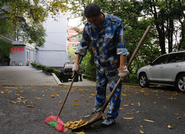 他是校园里的一名环卫工人,身着迷彩服、戴着白色手套的他正在清理枯枝落叶。他已经在学校工作了不少年头,经常看到他额上汗珠密布,仔细清扫细微角落里的每一片树叶,努力让自己负责的工作区域干净整洁。他说,劳动既是为了工作,也是为了生活。他简单的描述,像柴米油盐,粗茶淡饭一样平淡,但却让人感受到平凡中的深刻内涵。