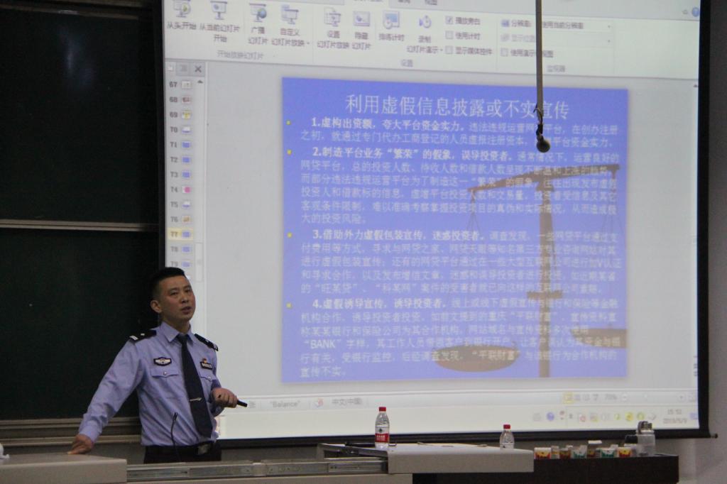 为提高同学们安全防范意识,5月9日下午,校区学生工作部(团委)、保卫部在第四教学楼4316教室举办了“顺庆公安法治讲堂进校园——大学生防范不良网贷、电信诈骗”知识讲座。顺庆公安分局西城派出所副所长雍彬担任主讲嘉宾,讲座由校区大学生就业创业指导中心副主任唐淼主持。校区保卫部治安科科长蒲和平,顺庆公安分局政治处副主任刘红玫、经侦大队副大队长阳卫东等同志和200余名同学参加此次讲座。