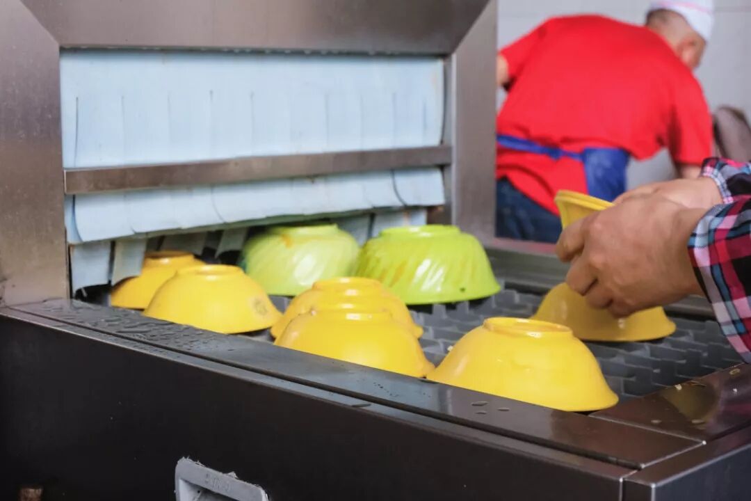 同学们近距离观看食堂工作人员洗碗