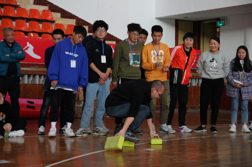 首先进行的比赛项目是摸石头过河,老师们用三块泡沫砖头垫在脚下用于移动,由于该项目考验方法和平衡。为了尽快到达终点,赛前,各位老师就在场边开始讨论交流着前进的方法,寻找最迅速的过关方式。选手小心翼翼,稳中求胜,即使有不慎失误仍奋勇直追。而后续队伍的老师则总结了前面队伍有利的行进方法,再有效地运用到了自己的队伍中。
