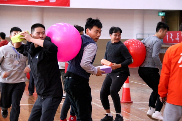 而在接下来的背夹球比赛中,气氛紧张起来。老师们两两一组,背靠背,夹住一个健身球,屏息凝神。随着裁判员一声令下,参赛选手你追我赶,在保证球不落地的前提把速度提升到最大,他们将后背交给队友,迈着统一的步伐,争分夺秒,全力以赴。