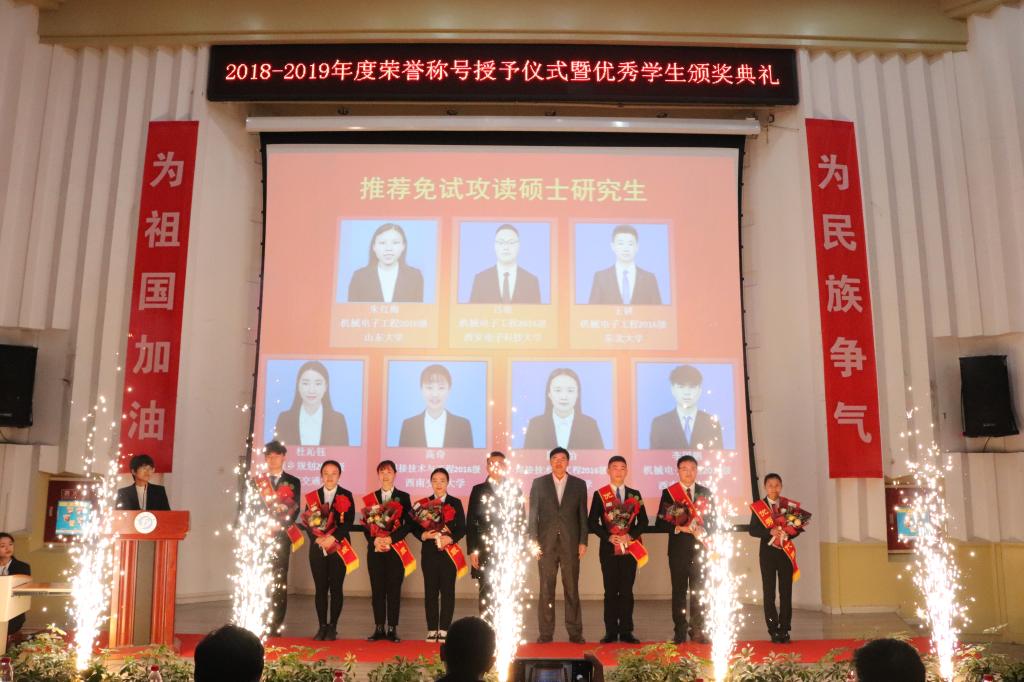 颁奖典礼分为引领、感恩、超越三个阶段。第一阶段重点表彰了本年度获得“三好学生”、“优秀学生干部”、“先进班集体”、“学风优良寝室”等荣誉称号的先进个人和组织;感恩环节着重对获得优秀学生奖学金、社会类奖助学金、国家类奖助学金、校长奖学金等数十类奖项获得者进行了赠鲜花,佩绶带仪式;最后,对本年度各类学科竞赛获奖代表进行了表彰,为第一届推免研究生佩戴了绶带并赠予鲜花。
