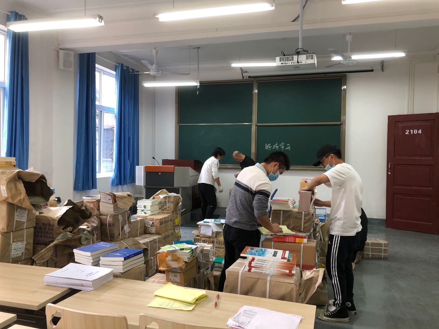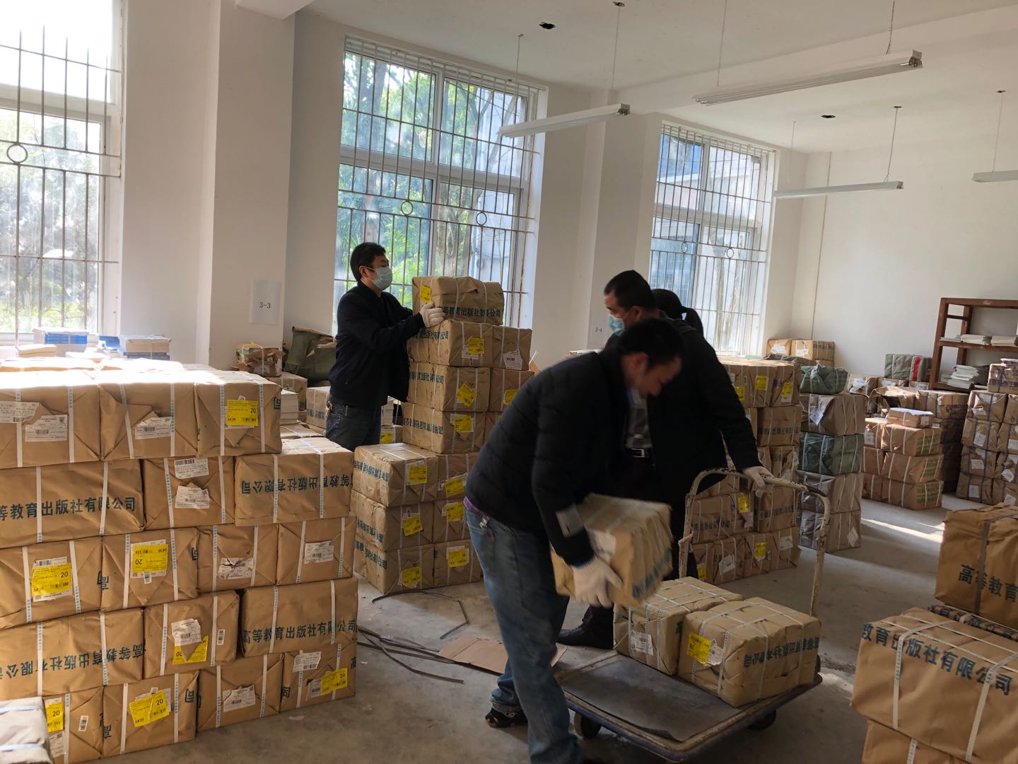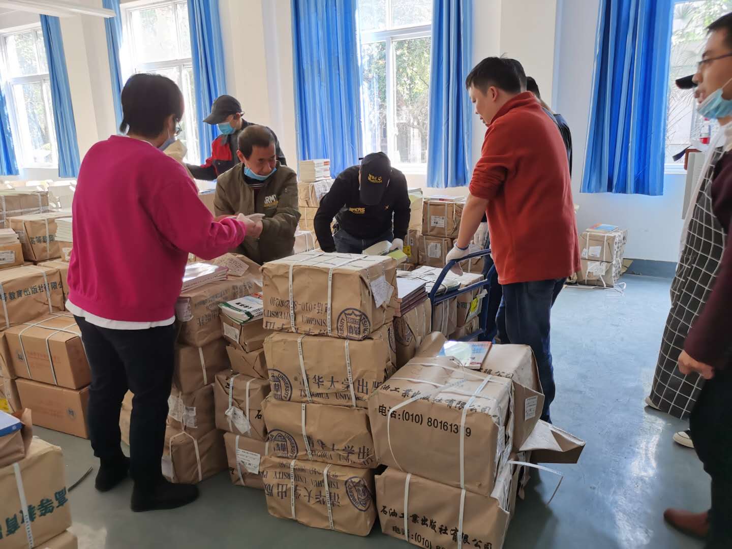 3月19日起,教务部全体职工加班加点完成了本学期校区各专业的教材入库、出库工作,并安排人手认真采集、核对学生选课数据,根据学生使用的教材因选课而异的特点,制定出每个专业的教材发书单。同时,教务部还联系学生工作部(团委)协助搜集了各专业需要纸质教材学生的家庭地址,并逐一核对。最后教务部和各学院部分在校老师根据教材发书单和学生家庭地址进行配书。