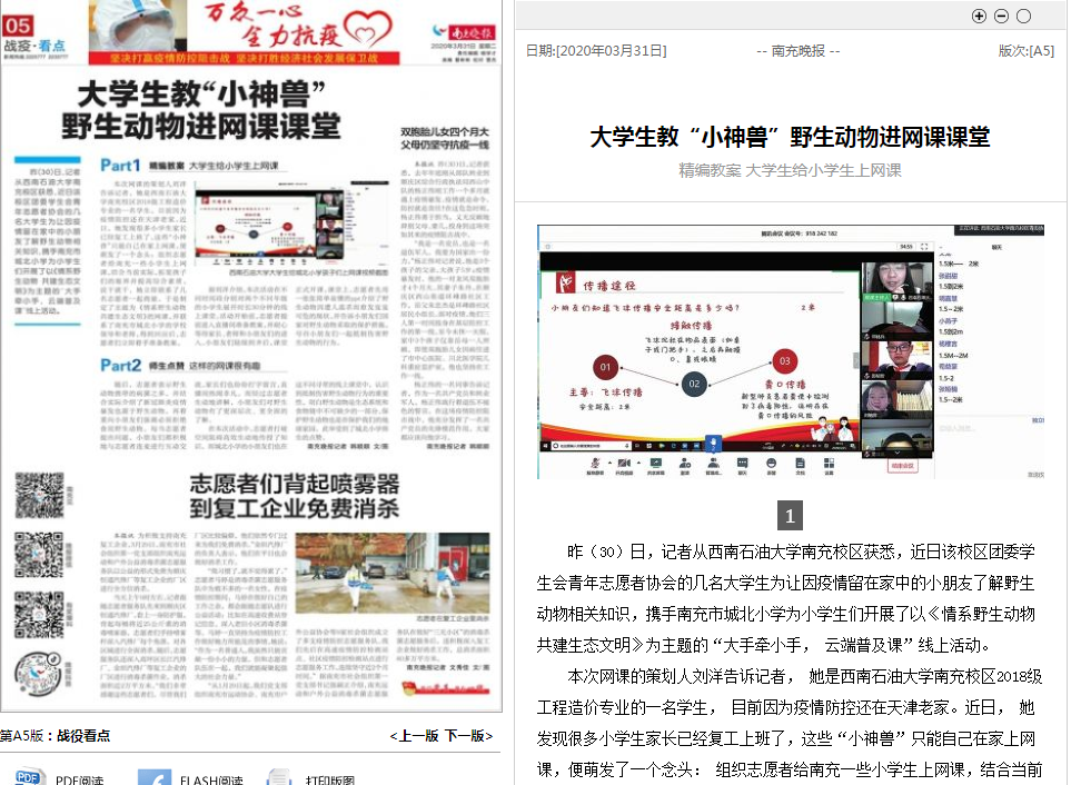 3月31日,南充晚报在“战疫·看点”专栏大篇幅重点报道南充校区大学生青年志愿者为南充市城北小学的小学生们开设了主题为《情系野生动物 共建生态文明》的“大手牵小手, 云端普及课”线上活动。