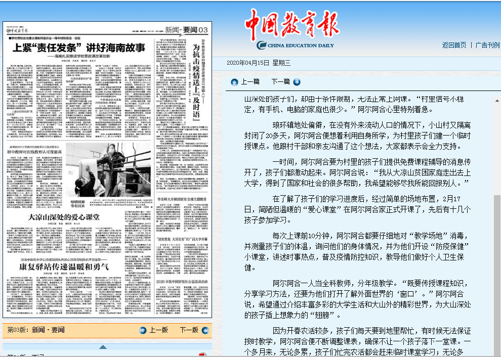 4月15日,中国教育报要闻版以《大凉山深处的爱心课堂》为题重点报道了南充校区财经学院学生阿尔阿合为大凉山孩童开设爱心课堂的事迹。
