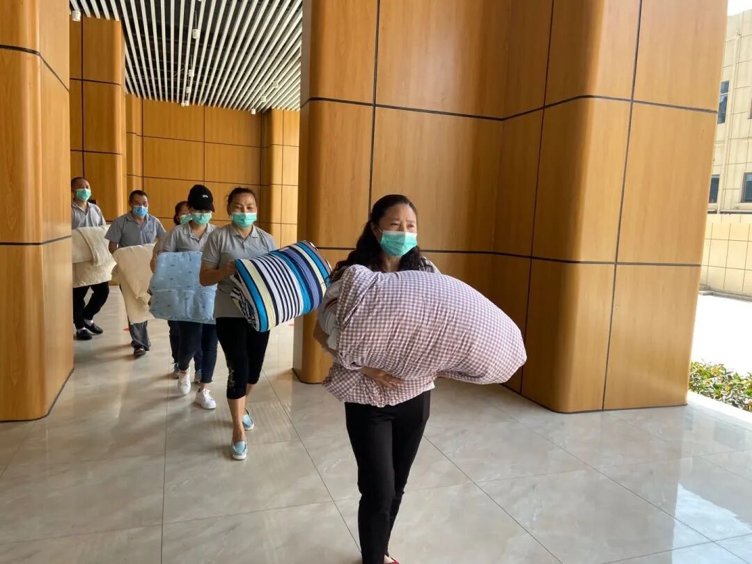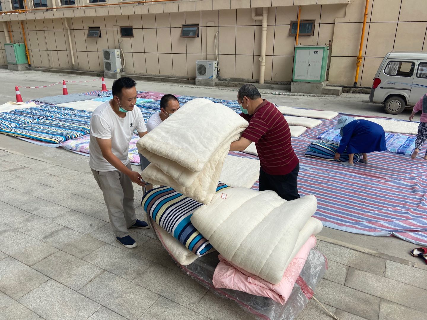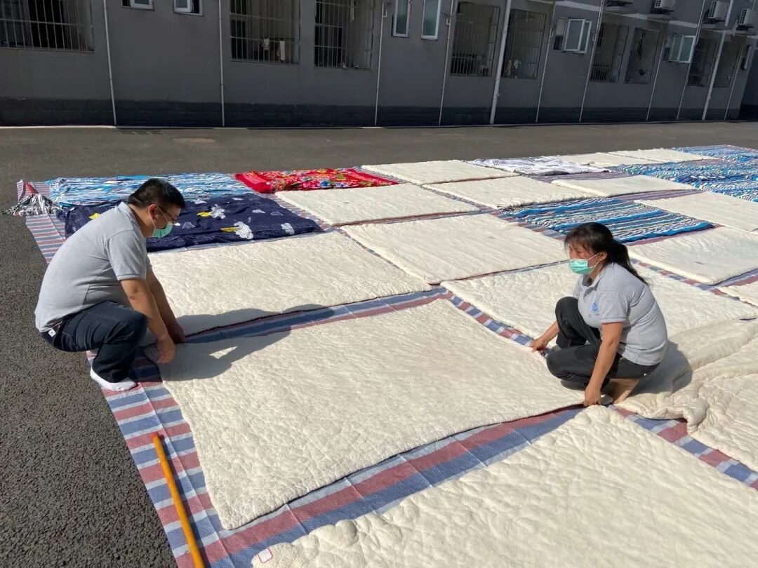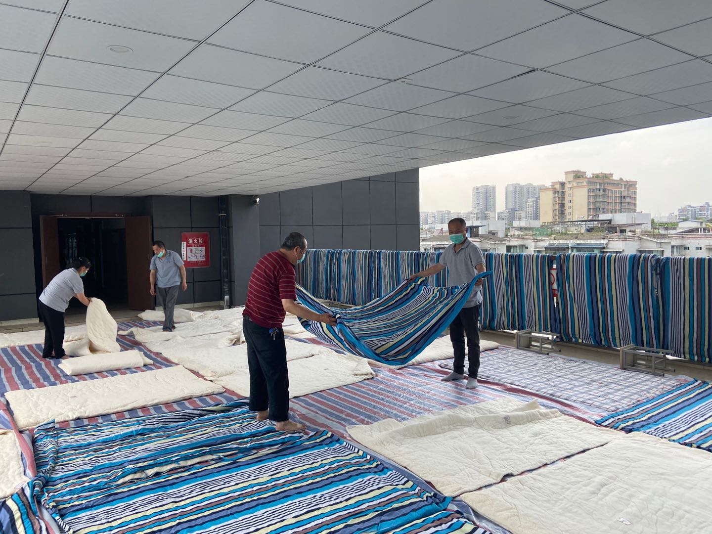 由于被褥多,人手少,工作量大,后勤职工每天需要十余次上下楼搬运被褥。经过十余天的辛勤劳动,圆满完成了晾晒被褥工作。