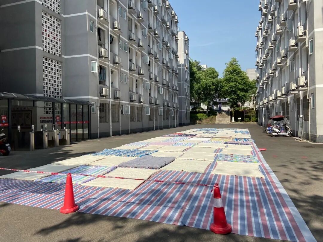 工程造价2018级黎芮伶同学感慨道:“疫情无情,人有情。虽然这场突如其来的疫情让我们暂时不能回到温馨的寝室,但是这段时间宿管阿姨和学校的老师们在烈日炎炎下帮我们晒被子的画面一直定格在我们心里,温暖着我们。”(大学生全媒体中心/王思宇 卞秀雯 图/后勤服务公司)