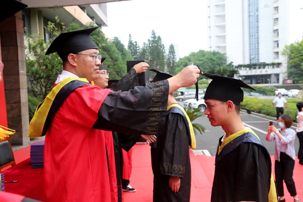 毕业班教师代表和毕业生代表分别发言。在学位授予仪式上,授位导师分别为毕业生代表拨穗、颁发学位证书,并与大家合影留念。