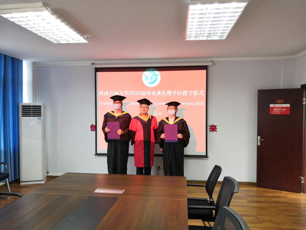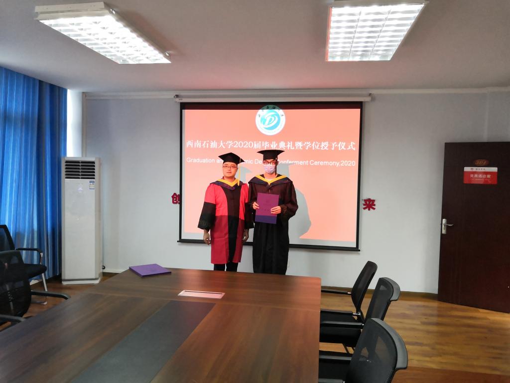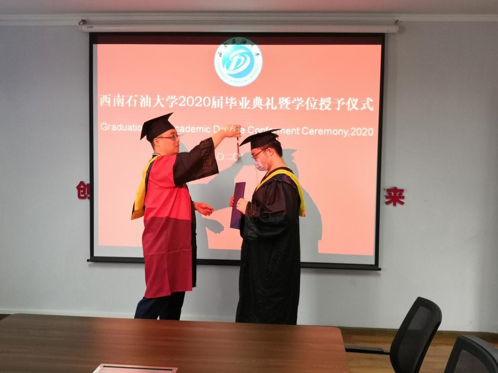 上午10点,信息学院院长胥林穿上授位服,在学院副院长梁军刚、毕业生老师的见证下,亲自为两位学生拨穗、授位,祝贺他们顺利毕业,鼓励他们在今后的学习工作中要勤奋进取,牢记西南石大精神,常回家看看。