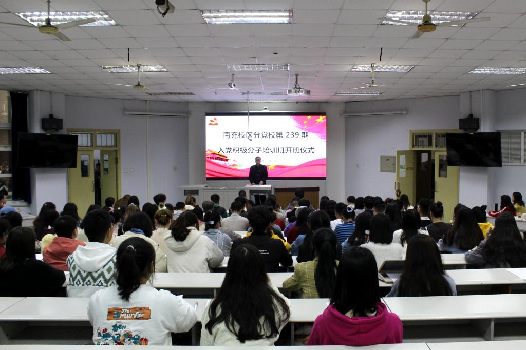 10月29日下午,学校党校南充校区分党校第239期入党积极分子培训班开班仪式在第四教学楼4316教室举行。党群工作部(工会)副部长陈万林参加开班典礼并讲话。工程学院辅导员胡钰灵、信息学院辅导员彭代超、财经学院辅导员谢曜励和党群工作部(工会)有关同志参加开班典礼。开班典礼由党群工作部(工会)组织人事科副科长刘晓静主持。