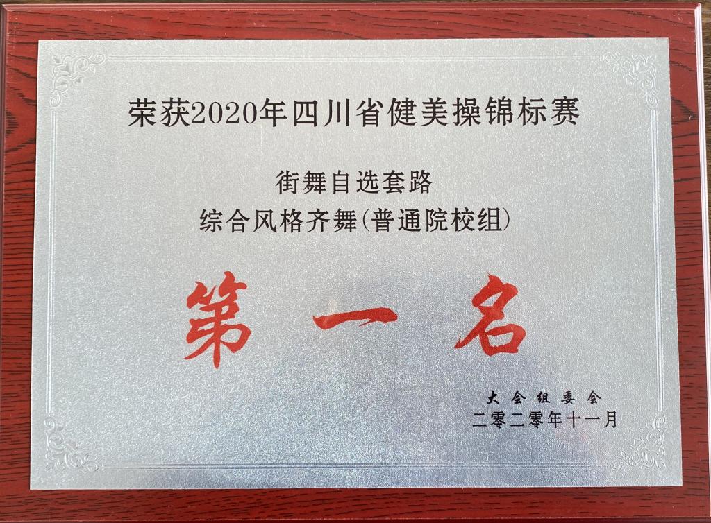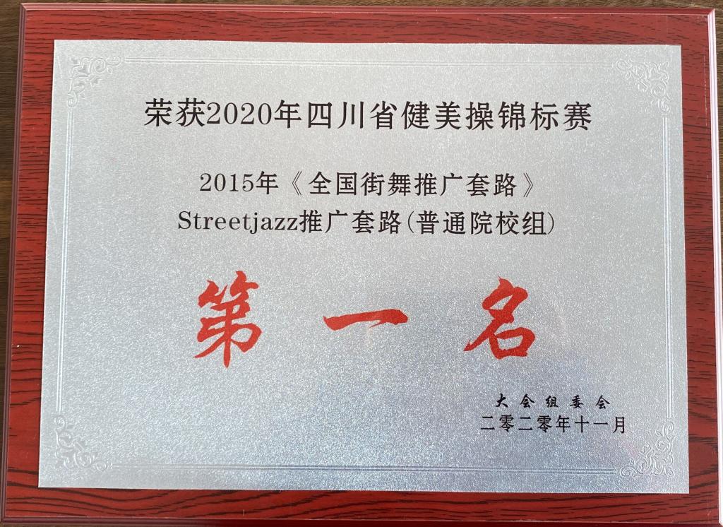 11月13日至15日,2020年四川省健美操锦标赛在成都市举行。基础教学部教师牛美惠、杨薇带领校区运动舞蹈队参赛荣获两项第一名。参赛节目《This is me 》荣获街舞综合风格齐舞项目第一名,同时street jazz推广套路(2015)项目获得爵士规定组第一名。