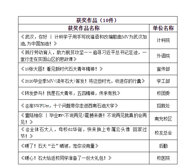 近日,由学校党委宣传部组织开展的2020年度“校园十佳新媒体作品”评选活动结果揭晓,南充校区团委推送的新媒体作品《不说再见》荣获西南石油大学2020年度“校园十佳新媒体作品”荣誉称号。