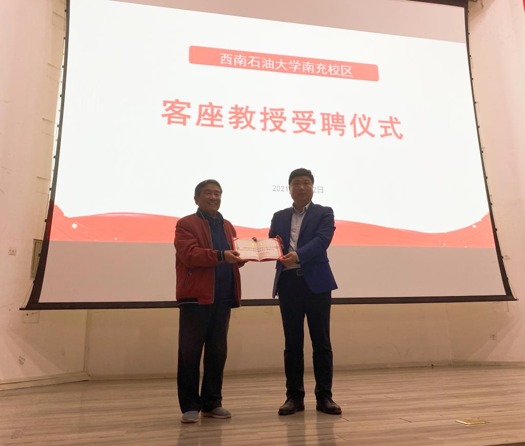 郝江岭为韩万斋教授颁发了客座教授聘书,学生代表为韩万斋教授送上了鲜花和祝福。
