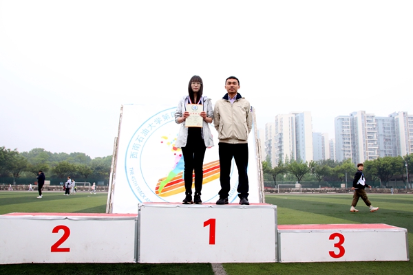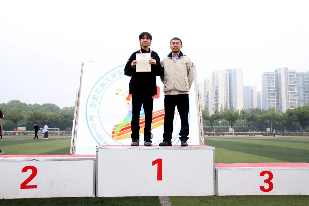 最终,工程学院能源与环境系统工程专业2019级罗玉以1米35的好成绩斩获女子跳高比赛第一名。