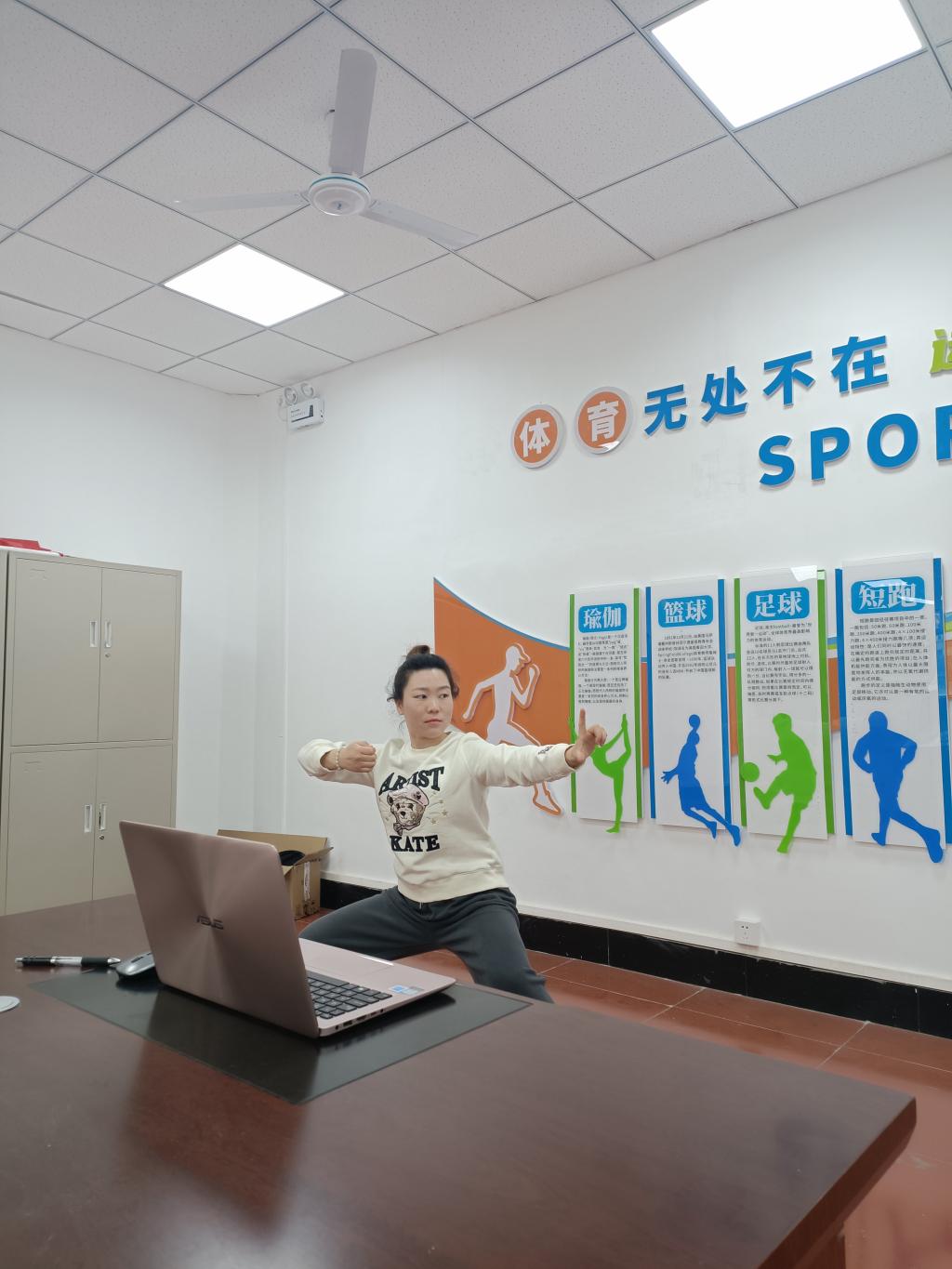 基础教学部武术教师刘童童说,线上直播授课受场地、器材等限制,需要老师在教学内容上出点“妙招”。考虑到学生居家学习条件、安全问题等因素,我选择太极拳八段锦作为线上教学内容。通过组织学生学习中华传统武术,既达到了强身健体的目的,也增强了学生的文化自信。