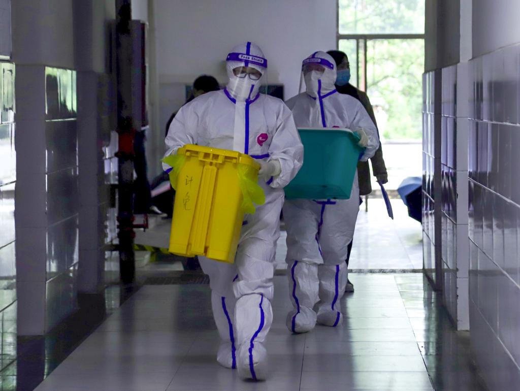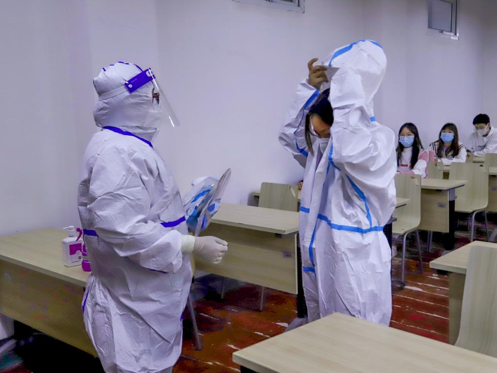 防疫人员指导重点学生穿戴防护服