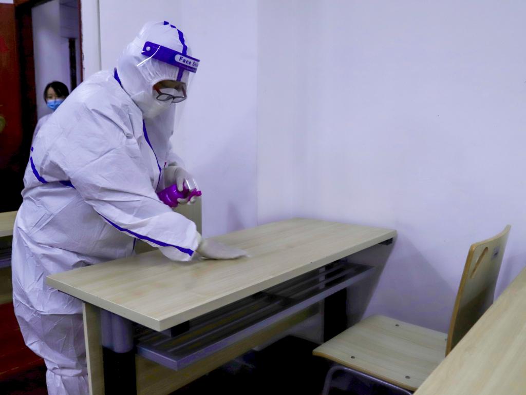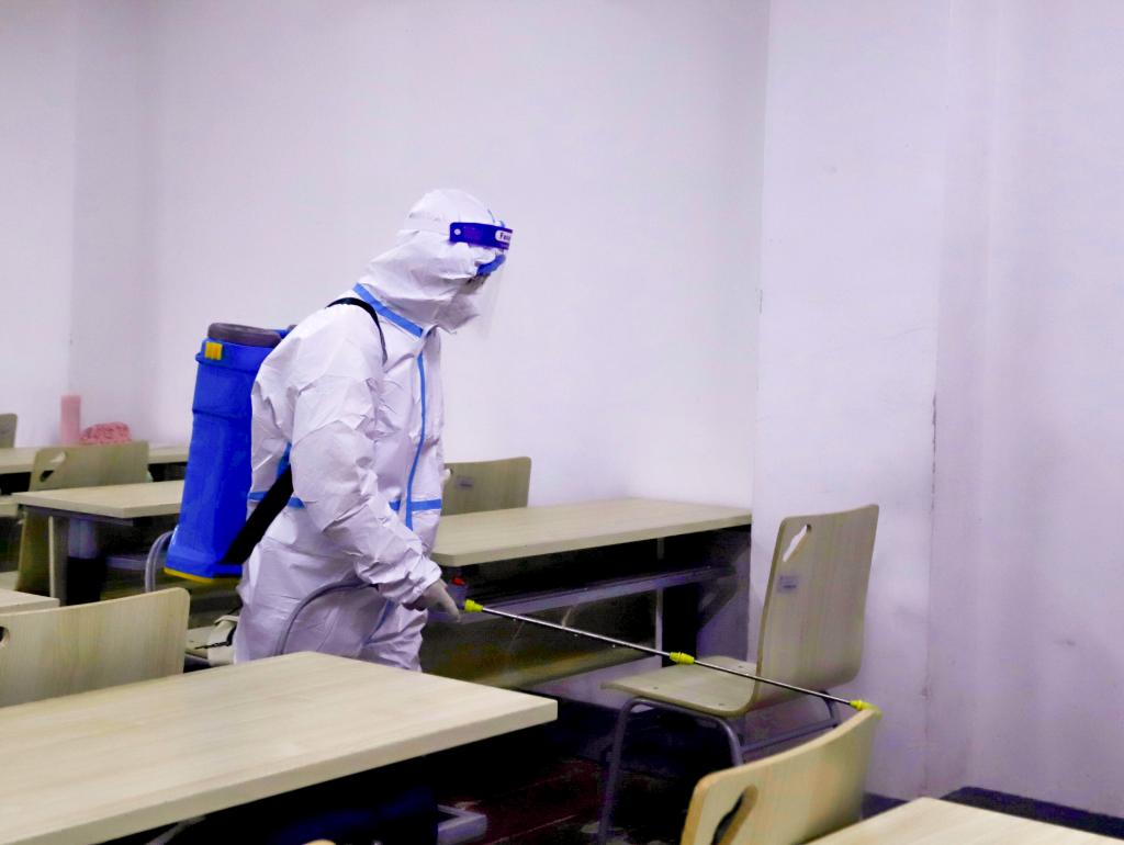 防疫人员对教学楼开展终末消毒