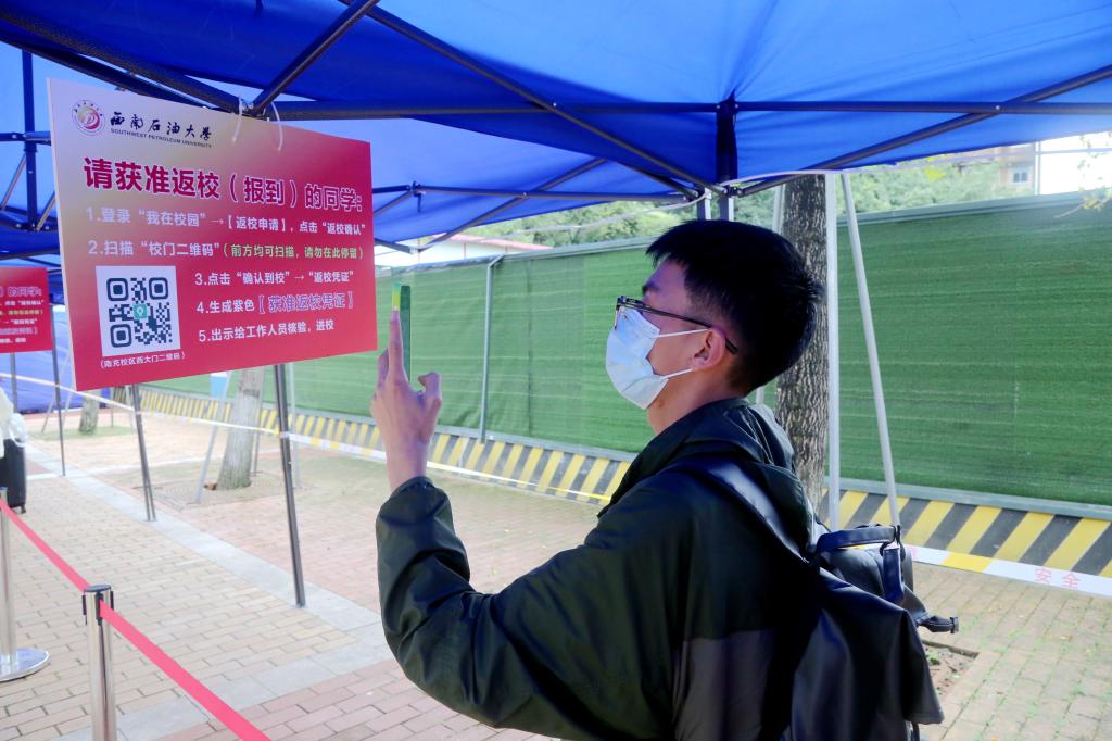 校门口交通临时管控,自驾车辆即停即行,返校学生下车后立即进入返校通道,随即进行手消毒并更换口罩。近150米的返校通道地面,间隔一米的温馨提示标志,提醒同学们保持安全距离。保卫部核查校园一卡通(或学生证、身份证)、四川天府健康码(绿码);校医院组织返校学生进行体温检测,核验返校学生“三天两检”核酸检测报告、通信大数据行程卡、风险城市旅居史、疫苗接种凭证等,并进行健康状况问询;学生工作部(团委)提醒学生扫到校码,获取“准返校凭证”,并扫校区场所码。筛查合格后,返校学生按规定进入校园,在石油魂雕塑广场接受核酸检测,领取温馨提示条进入寝室。