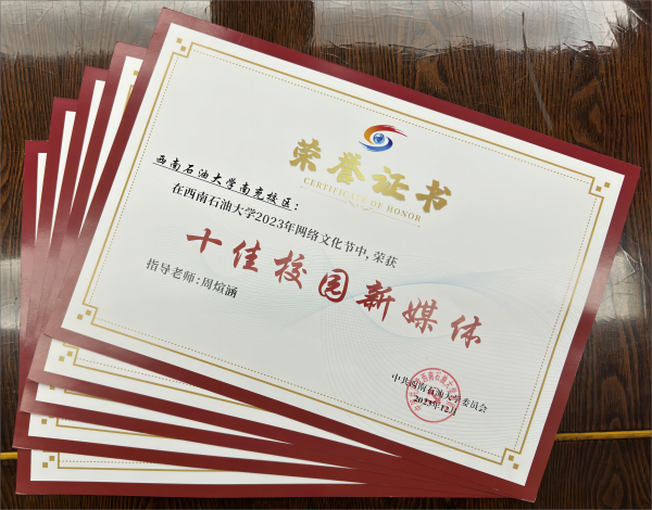 南充校区官方微信公众号“西南石油大学南充校区”荣获“十佳校园新媒体”荣誉称号。计算机科学学院数字媒体技术专业2021级陈芳、信息管理与信息系统专业2021级柳昊荣获“十佳新媒体学生达人”荣誉称号。南充校区大学生全媒体中心新媒体作品《有鱼有情怀,有渔有未来|这是龙井湖特殊的毕业礼》《去吧,追梦》荣获“十佳新媒体作品”荣誉称号。