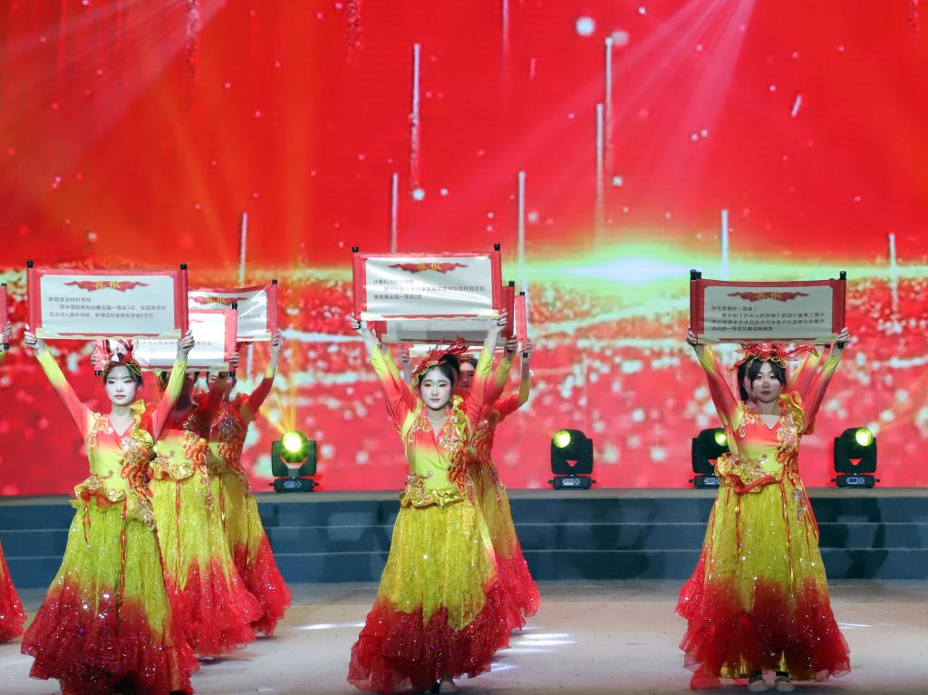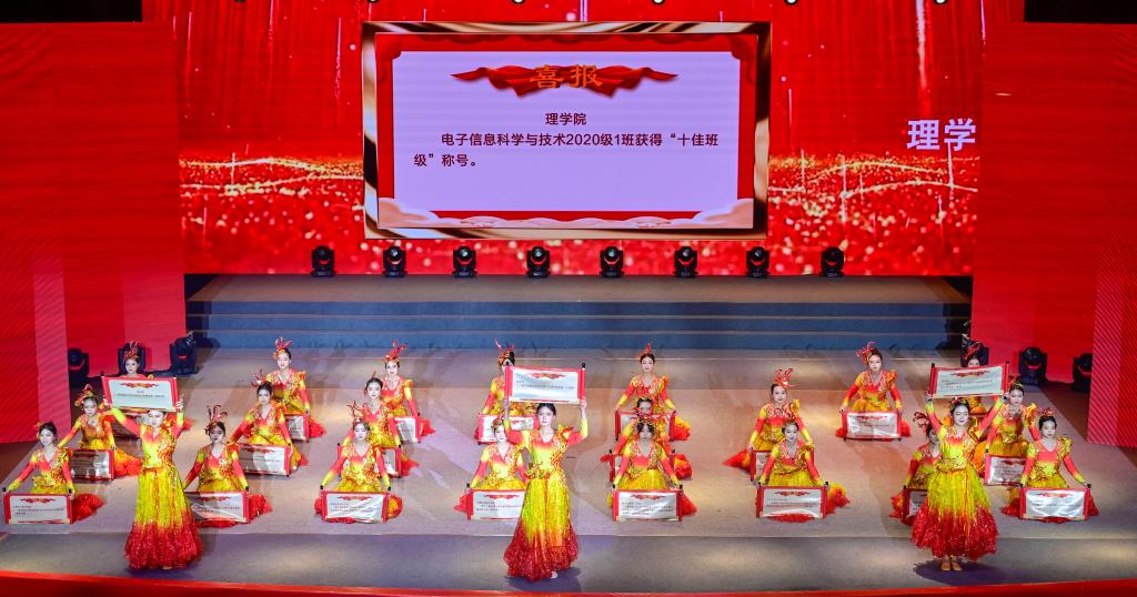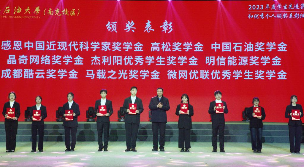 晚会现场还举行了颁奖仪式。南充校区领导分别为2023年度各类奖学金获得者代表和先进集体、优秀个人代表进行颁奖。