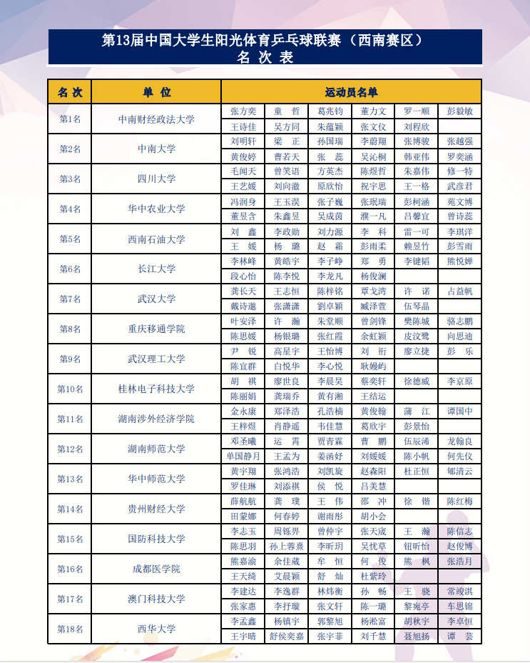 6月7日至9日,第13届中国大学生阳光体育乒乓球联赛(西南赛区)在绵阳梓潼举行。南充校区和成都校区学生联合组队参赛,以第5名的好成绩晋级全国总决赛。