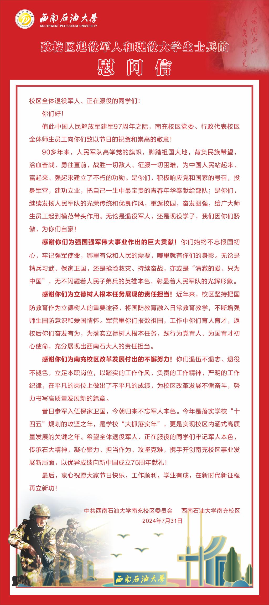 致校区退役军人和现役大学生士兵的慰问信