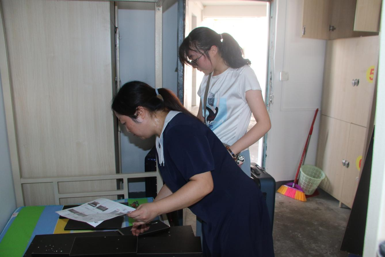 新生家长帮助新生布置寝室、整理床铺、熟悉生活设施使用方法