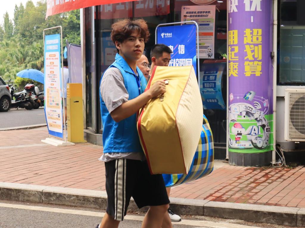 走进校园,蓝色迎新帐篷整齐排列、活力满满的迎新标语随处可见、各类指示引导牌清晰醒目、精心制作的欢迎喷绘和横幅成了一道道美丽的风景线。校门口、学生区新生集中下车点,迎新志愿服务站的学生志愿者早早在等待,“学弟学妹,跟我来!”“行李给我吧!”一趟趟往返,热心主动地带领新同学们走完报到流程,一对一,点对点,环环相接,保证不让一个小柚子落单。“大一刚来学校的时候,对什么都感到很陌生,我当时也是学长学姐带的,所以这次能有机会去迎接新生,把这份温暖传递下去,我很开心,”青年传媒中心志愿者曾怡嘉笑着分享道。