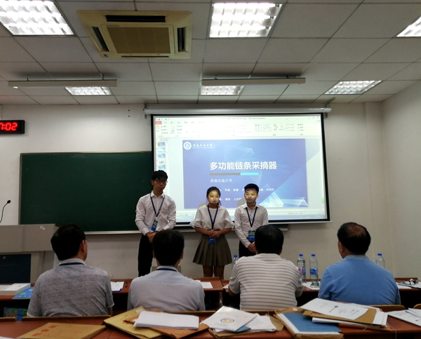 其中,南充校区工程训练中心、工程学院组织2支代表队参加了实物组决赛,成都校区工程训练中心组织1支学生代表队参加了慧鱼组决赛。决赛期间,我校三支学生代表队经过现场问答、PPT答辩等环节的激烈角逐,均荣获一等奖。其中一等奖实物作品“多功能链条采摘器”“多功能草莓采摘器”和慧鱼模型“小型跨路停车装置”,无论从选题的新颖性、创新性和实用性、作品设计的合理性、设计图纸质量等方面,还是作品制作及功能实现等方面均得到评委高度认可,也吸引了参赛兄弟院校师生的观摩,获得了一致称赞。