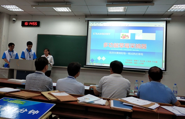 校区学生参赛作品“多功能草莓采摘器”现场答辩场景